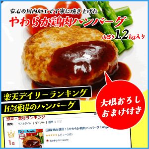 おまけ 大根おろし 内容:500g 原材料:大根 原産地:国産 やわらか鶏肉ハンバーグ60g×20個入りサイズ 栄養成分表示 食品単位(1個(60g)あたり) エネルギー 124cal 炭水化物 6.8g たんぱく質 6.3kg 食塩相当 0.7g 脂質 7.6g やわらか鶏肉ハンバーグ100g×12個サイズ 栄養成分表示 食品単位(1個(100g)あたり) エネルギー 206cal 炭水化物 11.3g たんぱく質 10.4g 食塩相当 1.2g 脂質 12.7g 調理方法 180℃に温めたオーブンで60gサイズは約12分、100gサイズは約14分加熱してください。